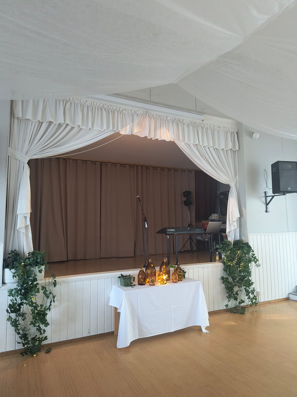 Salin etuosassa on näyttämökoroke, jossa reilusti esiintymistilaa esim. bändille. Siellä on myös kaiuttimet ja mikrofonit äänentoistoon sekä videotykki ja valkokangas.