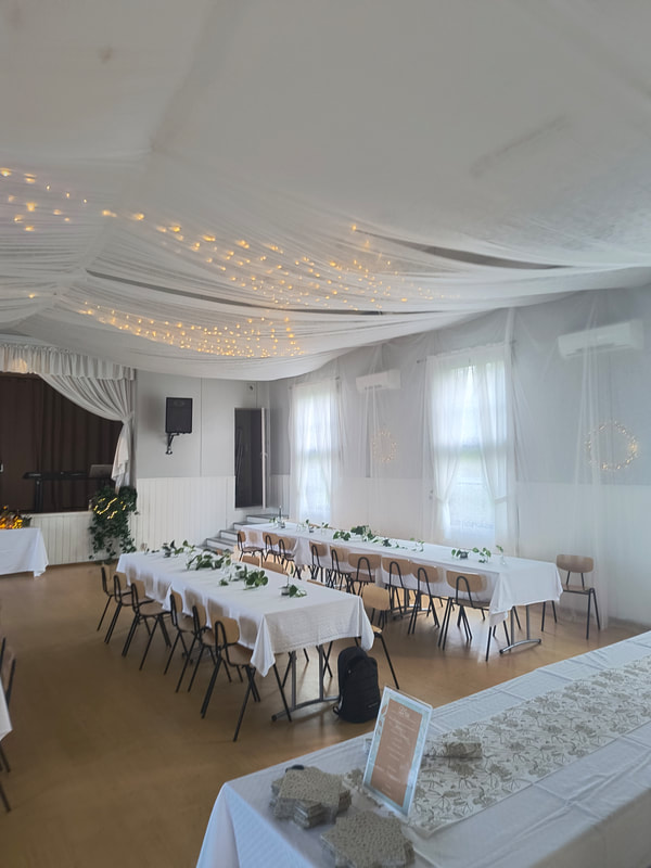 Sali on noin 10 x 11 metrin kokoien ja sinne mahtuu mukavasti 100-130 henkilöä ruokailemaan. Käytössä on 20 kuuden hengen ruokapöytää ( koko 80x 160 cm), jotka voi ryhmitellä monin eri tavoin riippuen juhlioiden määrästä.